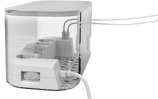 Staubschutz durch geschlossene Kabelbox: Die Steckdosen befinden sich in einer Kabelbox, die Steckplätze und Steckerverbindungen vor Staub schützt und das Kabelchaos beendet.