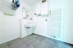 Das Badezimmer ist mit einer bodengleichen Dusche, Waschbecken, WC sowie einem praktischen Anschluss für Waschmaschine und Trockner ausgestattet. Statt eines Fensters sorgt eine Lüftungsanlage für die notwendige Frischluftzufuhr.