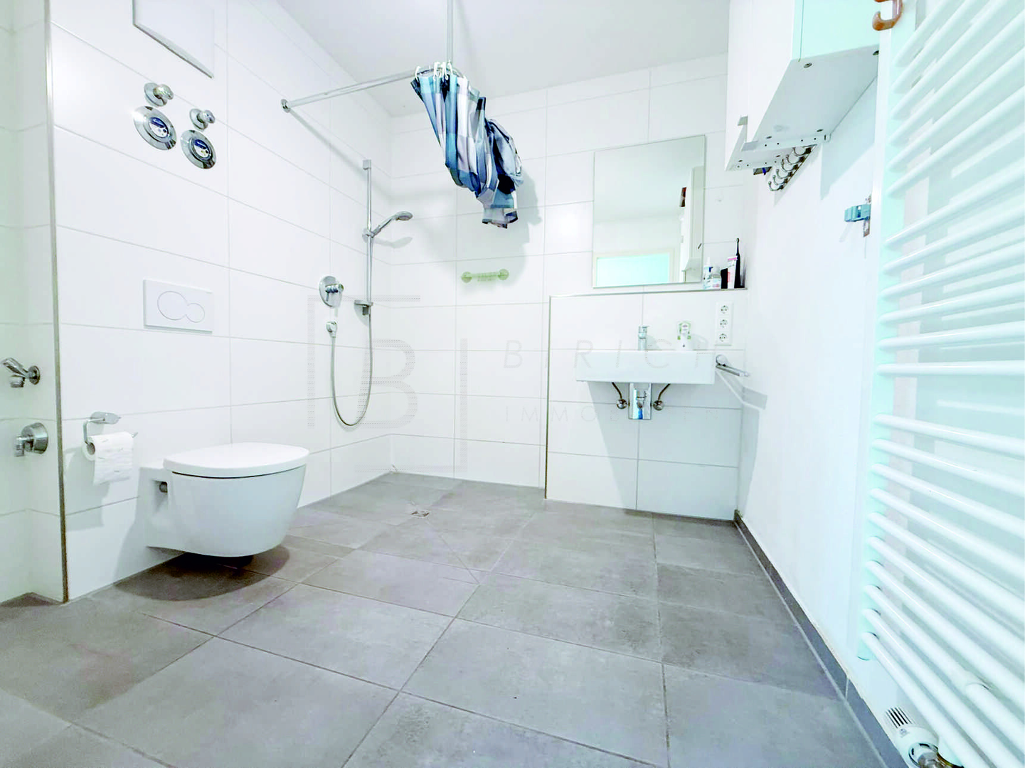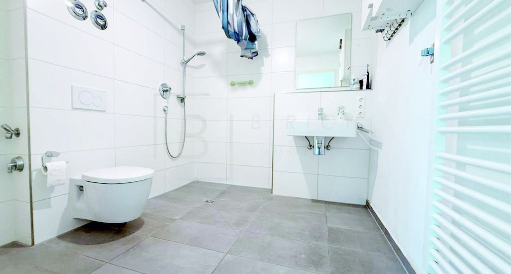 - Badezimmer: Bodengleiche Dusche, Waschbecken, WC, Waschmaschinen-/Trockneranschluss, Lüftungssystem